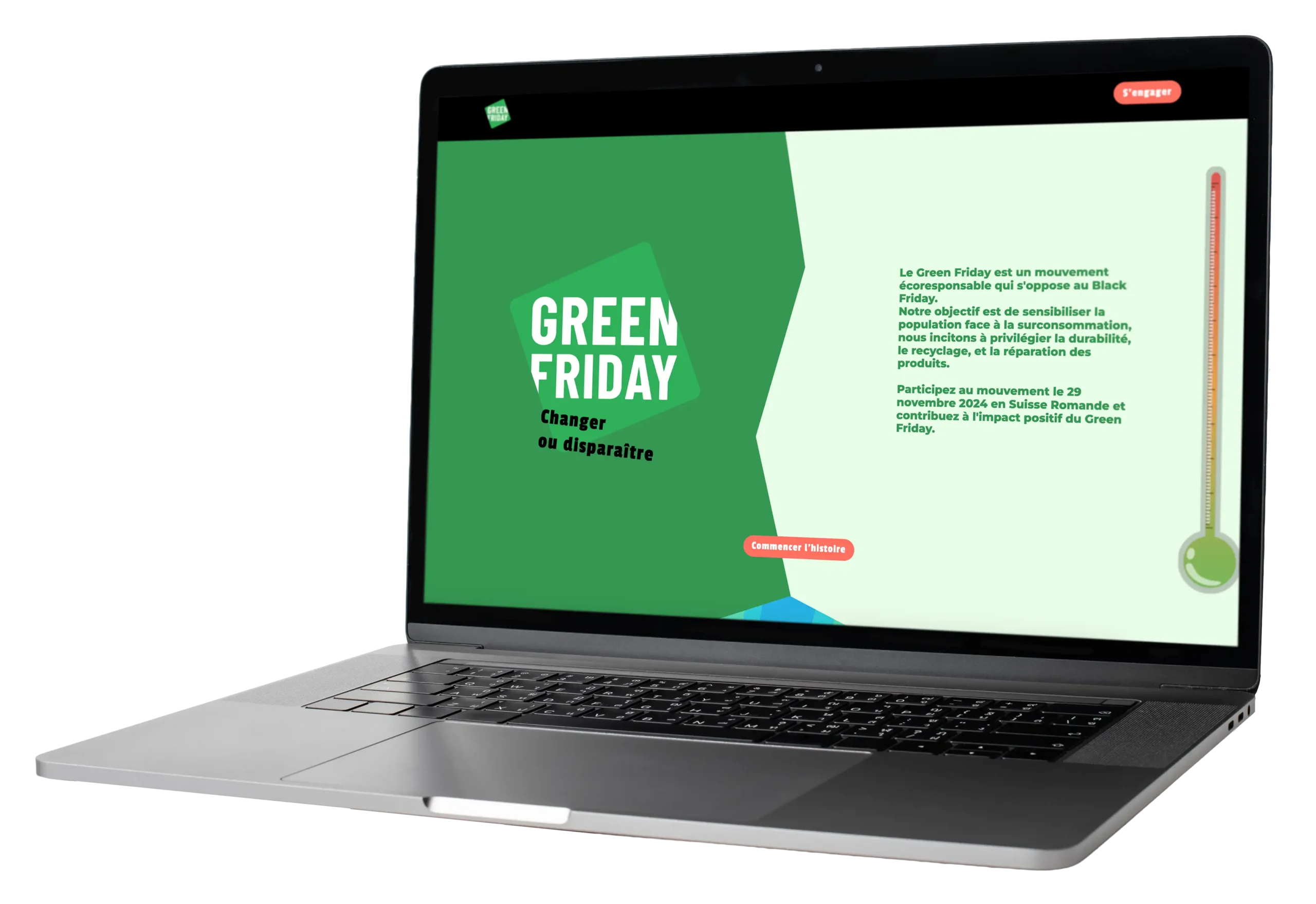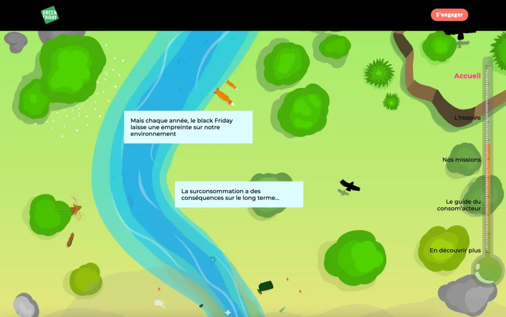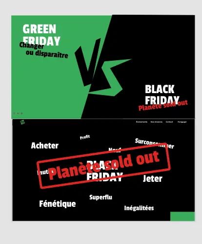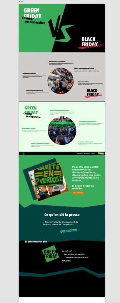 Ce projet consistait à concevoir (design et code) un site antenne ludique en Suisse pour promouvoir le mouvement Green Friday. L’objectif n’était pas de reproduire le site officiel, mais d’inciter à sa consultation tout en sensibilisant au boycott du Black Friday, à travers une approche visuelle dynamique et engageante.