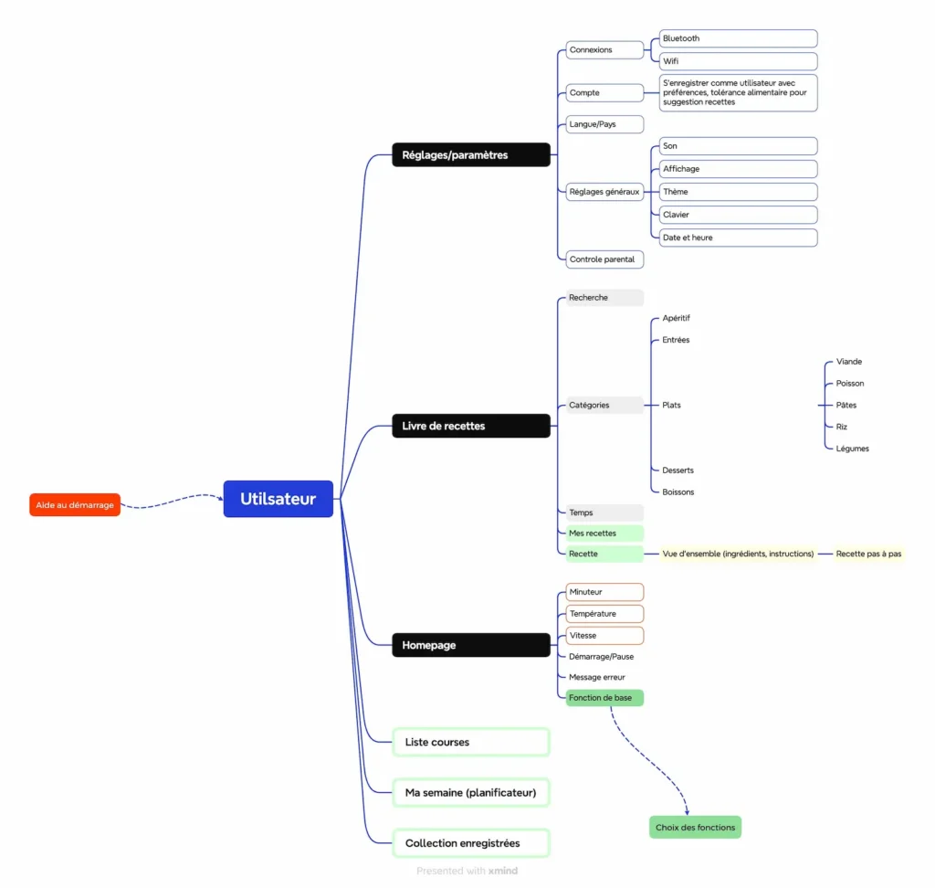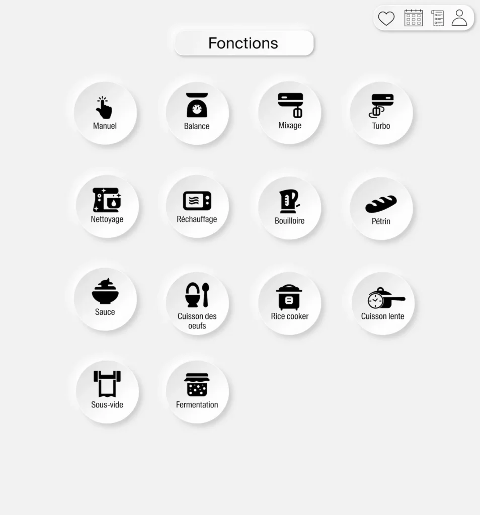 J’ai commencé par analyser les interfaces de robots cuiseurs existants. Rapidement, une évidence s’est imposée : les fonctionnalités sont nombreuses, mais la simplicité d’usage fait la différence.